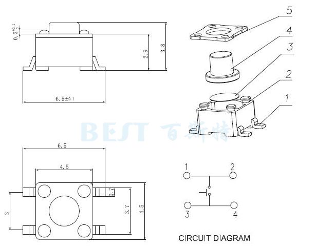 TS-1102A是貼片4.5×4.5輕觸(chù)開關(guān),方形輕觸(chù)開關(guān),有高度3.8/4.8/5.0/7.0四種高度,TS-1102A耐高溫,可以回流焊,
